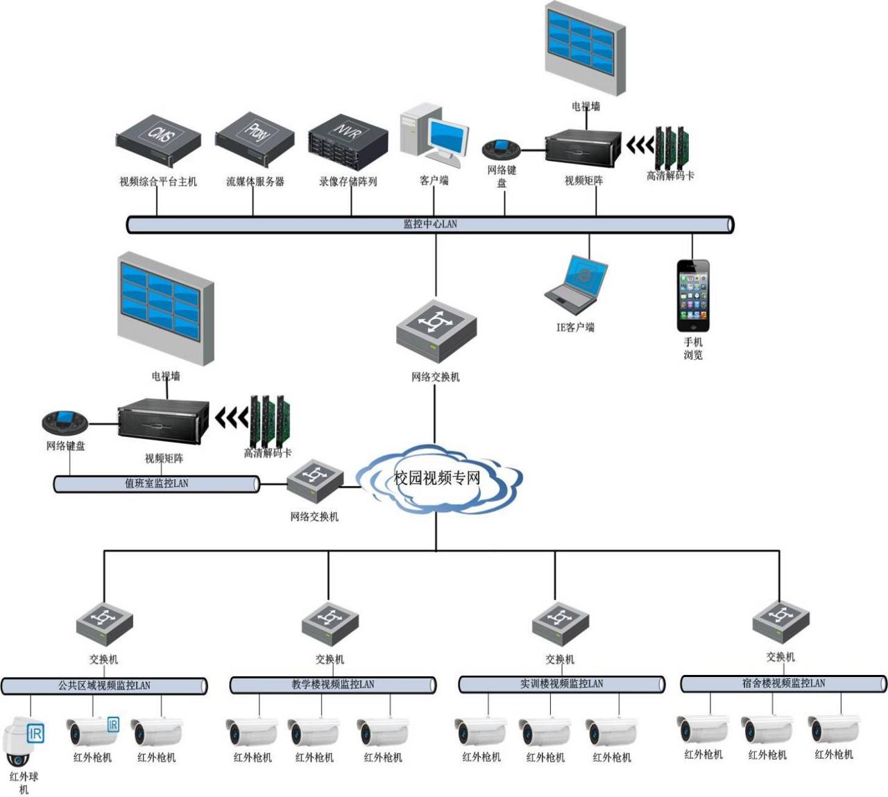 (5)視頻監控系統主要由前端攝像機組成,根據現場不同的環境和應用選用不同的攝像機,在出入口選擇紅外攝像機,在樓梯口和走廊設置紅外槍式攝像機及寬動態紅外攝像機,在周界可以選用紅外槍式攝像機,在學院室外開闊區域選用室外球型攝像機等。